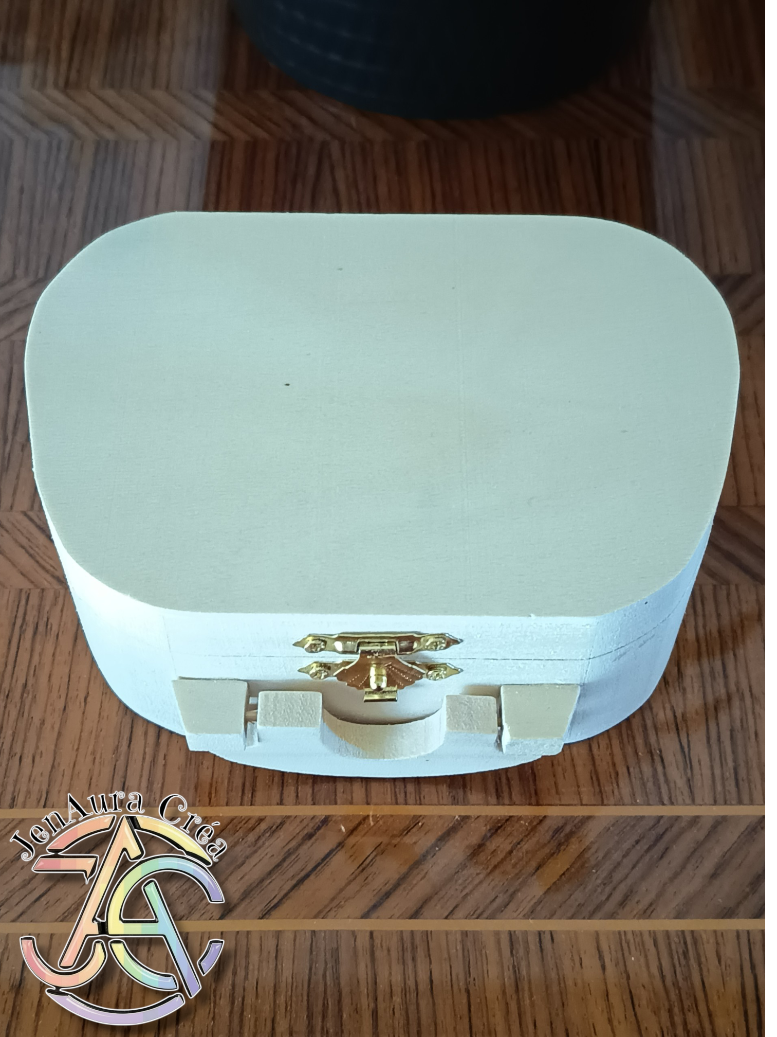 Une magnifique boîte en bois en forme de valise contenant une rose crochetée de couleur bleue marine.